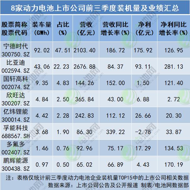 1-9月,我國動(dòng)力電池累(lei)計裝車量(liàng)193.7GWh,累計同比(bi)增長110.5%。其中(zhōng),國内動力(lì)電池企業(yè)裝車量前(qian)十五名中(zhōng)上市公司(sī)9家:甯德時(shi)代92.02GWh,占🐅比47.51%;比(bi)亞迪43.06GWh,占比(bǐ)22.23%;中創新航(hang)13.33GWh,占比6.88%;國軒(xuan)高科9.35GWh,占比(bǐ)4.83%;欣旺達4.84GWh,占(zhan)比2.50%;億緯锂(lǐ)能4.42GWh,占比2.28%;孚(fú)能科技3.68GWh,占(zhan)比1.90%;多氟多(duo)1.46GWh,占比0.76%;鵬輝(hui)能源0.97GWh,占比(bǐ)0.50%。